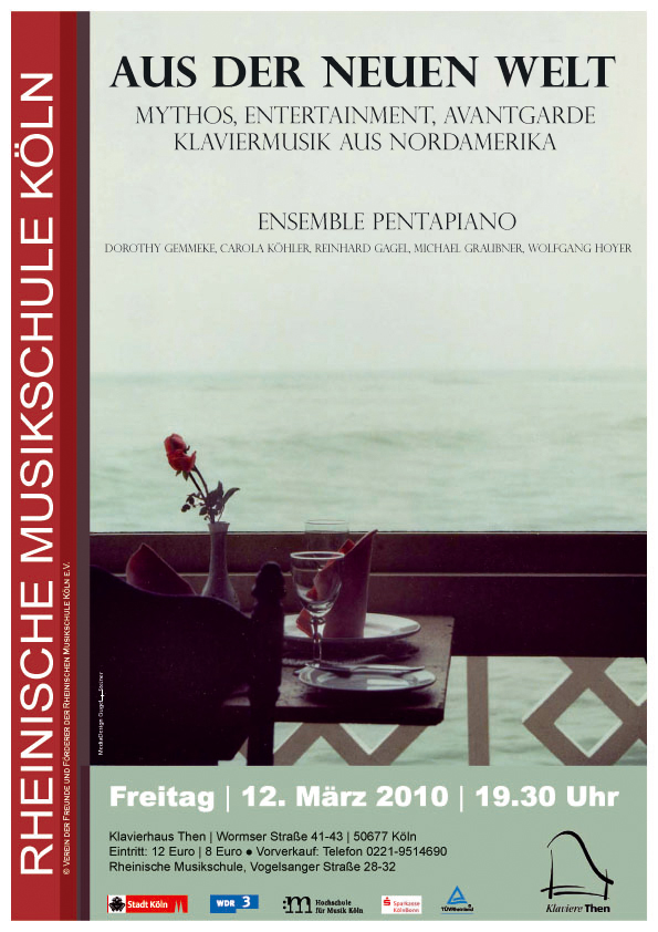 Fünf PianistInnen an zwei Klavieren – das ist die Konstellation, mit der die Kölner MusikerInnen Dorothy Gemmeke, Carola Köhler, Reinhard Gagel, Michael Graubner und Wolfgang Hoyer mittlerweile das vierte Programm gestaltet haben. Nach „PianoPiano – eine Klaviercollage“ in 2002 folgte das Programm „Klangbilder“ in 2003 und „Stadtklänge“ in 2006. „Stadtklänge“ wurde im Januar 2007 im WDR3 in der Konzertreihe „Nachtmusik“ aufgeführt. Wolfgang Hoyer besorgt die vier- und achthändigen Arrangements, die Idee und Konzeption des Programms stammen von Reinhard Gagel. Das neue Programm heißt „Aus der neuen Welt: Mythos, Entertainment und Avantgarde“ , es collagiert Klaviermusik aus Nordamerika und wird im Herbst 2009 erstaufgeführt.